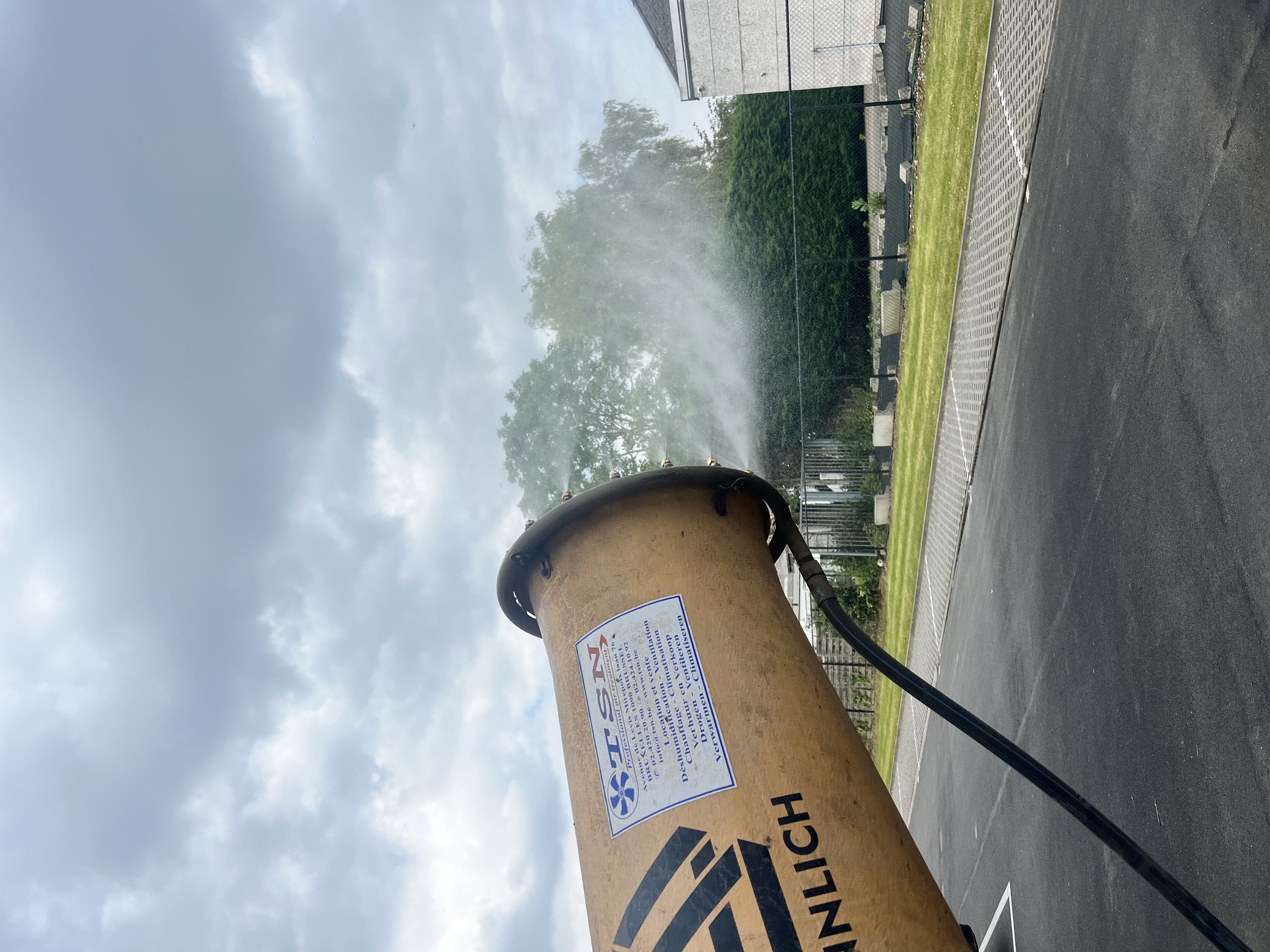 L'eau sous pression est pulvérisée par des buses à l'extrémité du canon de brumisation. Un puissant ventilateur propulse les fines particules l'eau à la manière d'un canon à neige.