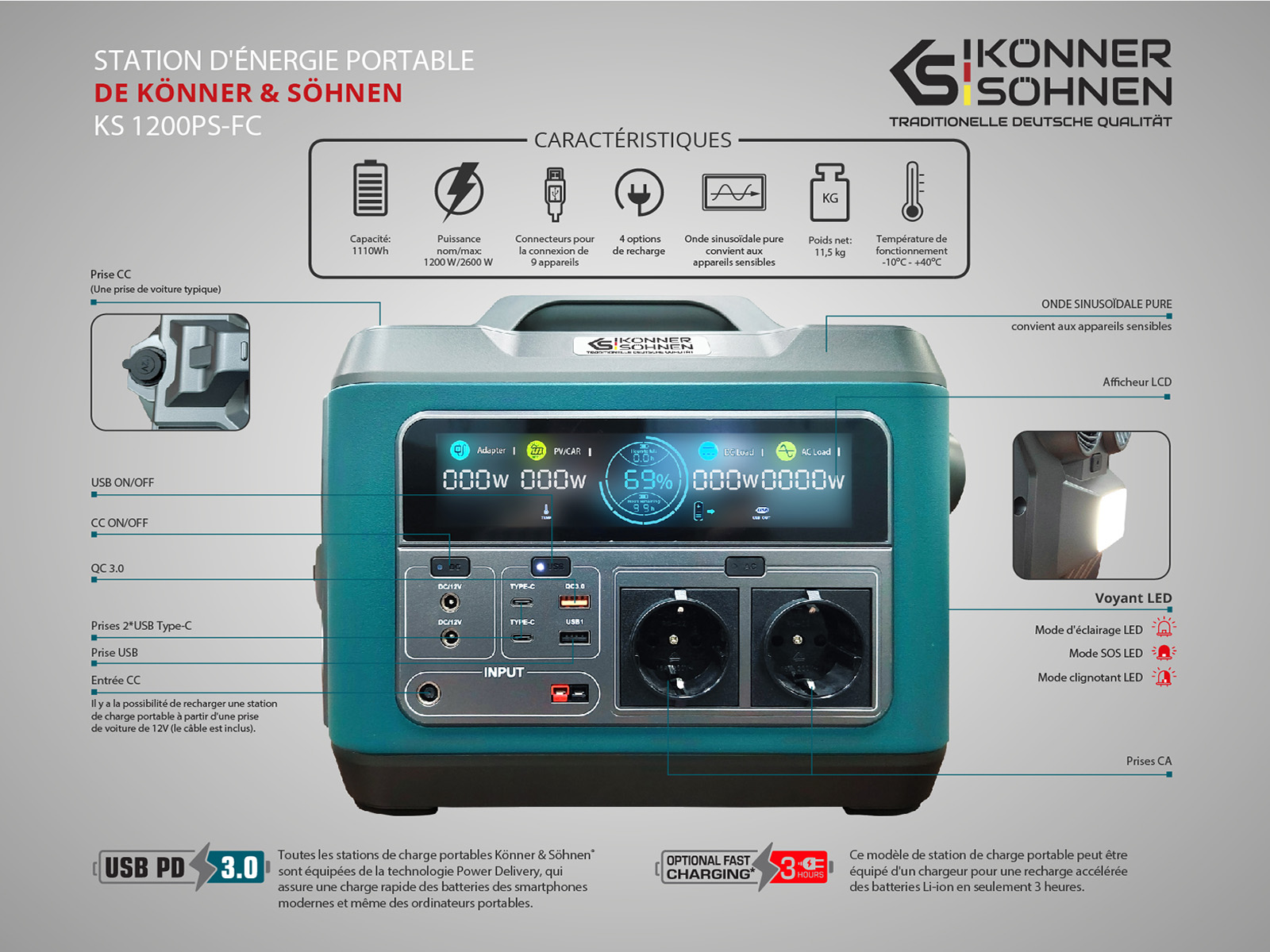 La centrale électrique portable KS 1200PS-FC de la marque allemande Könner & Söhnen sera un assistant pour charger les appareils sur la route ou en cas de panne de courant. Sa puissance sera suffisante pour faire fonctionner des équipements tels qu'un smartphone, un appareil photo numérique, une tablette, un drone,un aspirateur, un éclairage, un mini-réfrigérateur, un ordinateur portable, une pompe pour gonfler les roues/ballons, un appareil respiratoire, une télévision, un ventilateur, une visseuse électrique. Il fonctionne silencieusement, il vous permettra donc d'alimenter des appareils électriques et de profiter de votre temps sans aucun bruit gênant.